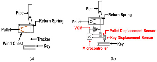 The pipe organ is the most technically advanced classical instrument, and can produce the widest dynamic range of volume sound. In the pipe organ, sound is generated by air flowing in the pipe. The flow of air is controlled by the valve called the pallet. The operator of the pipe organ, the organist, controls the sound generation by pressing the keys. The control signal of the keys is transmitted to the pipe valves by the tracker action (Figure 1 and Figure 2a). The organist, while playing, can control the generation of individual sounds by means of the keyboard, i.e., playing a melody, and the type of sound and its volume by means of individual voices are known as registers. The dynamics of the sound generation in the pipe-blowing depends on the opening speed of the pallet [1]. This depends not only on the organist, but also on the type of basic action solutions, such as mechanical, pneumatic and electrical trackers [2]. The mechanical solution of the action is the oldest, and has been used since ancient times for the first organ construction. The rest of the action solutions were introduced into pipe organs in 19th century. Nowadays, mechanical and electrical actions are the most common in the realization of instrumental pipe organs [3,4]. In the mechanical, action the organist has full control over the production of sound and over the dynamics of the opening of the pipe valves [5,6,7]. Electric action allows the organist to mechanically disconnect and move the keyboard, but in the case of electric action, the dynamics of opening the pipe valves is constant, and this is due to the dynamics of the electromagnetic actuator that moves the pallet. The direct electric action has a maximum repetition frequency of 10 Hz [8,9,10]. For full control over the production of sound, organists prefer to use the mechanical action. Recently, new solutions of action have been applied to the pipe organ, using sensors, microcontrollers, and servos or other electric actuators for mechatronic action [11,12]. The mechatronic mechanism can have positive mechanical and electrical operating characteristics, i.e., it should allow the full control over the dynamics of the generated sound and allow the keyboard to move away from the pipe organ [13,14]. Independently of the action system, a microcontroller and electrical actuators are implemented in modern pipe organs as controllers of the registration and used to control the type and the volume of the sound [15]. Voice coil motor actuators (VCMs) are widely used in precision motion systems, miniaturization of electronic equipment and dynamic keyboard systems of musical instruments, which are known for their high-speed and high-precision positioning systems, as well as their simple design and easy control [16,17,18,19]. VCM actuators, which most commonly have a structure similar to hard disk drives (HDDs), are characterized by their small size in the direction of the rotational axis, allowing many actuators to be placed side-by-side in small spaces for miniature organ instruments [20,21]. This property is not shared with other organ mechanism solutions with similar characteristics, such as the use of special electromagnets and stepping motors [22,23].