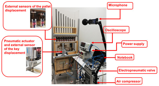 The sound measurements were carried out with sound level meter Svantek 971. The sound level meter (SV 971A Class 1) is used for building acoustics measurements, uses a microphone offering a linear measurement from 27 to 140 dB in a single range and meets the IEC 61672-1:2013 standard’s performance criteria such as linear operating range, frequency response and temperature operating range. A Supervisor software package SvanPC++ that is an advanced PC software supporting SVANTEK measuring instruments, is dedicated for sound level meters, noise dosimeters and human vibration meters. The microphone connected to the Supervisor is remembered enabling automatic creation of instruments’ database containing important information such as uploaded settings and firmware version, calibration validity date or instrument clock time. For the displacement measurements Waveshare Infrared Reflective Sensors were used. The reflective modules with IR sensors equipped with digital and analog output work with a voltage from 3 V to 5.3 V. Signals from these sensors were measured by Rigol DS1054Z oscilloscope. The key actuation system consists of a pneumatic actuator ADVU-16-20-A-P-A Festo-156596 controlled by a MEH-5/2-1/8-P-B Festo Solenoid valve. The pneumatic system was supplied by an air-compressor. The time of the piston stroke of the pneumatic actuator was adjusted by controlling the exhaust air flow through the throttle valves. The solenoid valve was controlled by an electric switch in the 24 V DC circuit supplied by TTi CPX400D laboratory power supply as shown in the Figure 3.