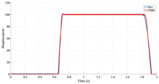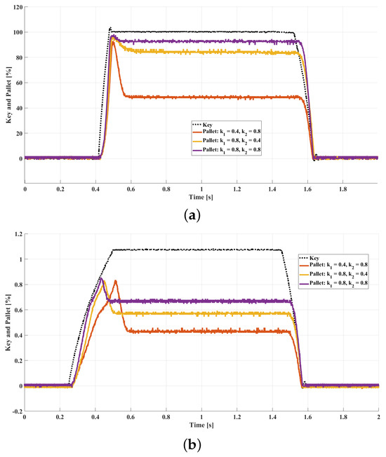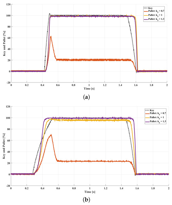 As part of the study, the effect of tuning parameters in particular , for the closed-loop mode system and for the open-loop system on the pallet opening rate and key pressing was checked. The tuning parameters are included to adjust the values of the parameters in control algorithm to improve the performance of key operation on the given open or closed loop system. The experimental tests have consisted of pressing and then releasing a key. The key was pressed using a pneumatic actuator in the same way as described previously. The tests were performed for slow and fast speed of the pneumatic actuator acting on key and in consequence on opening pallet. The results for the closed-loop control system and for different speed of pneumatic actuator acting on key are shown respectively in Figure 10a,b.