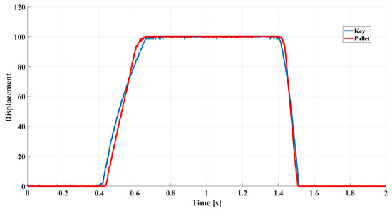 Figure 4 and Figure 5 show the dynamics of key displacement marked with blue line and the dynamics of pallet displacement marked with red line respectively for quick and slow response of the pressed key. It can be noted that when the key is pressed quickly, the response is almost immediate (Figure 4). The delay between the key and the pallet is less than 10 ms. When the key is pressed slowly (Figure 5), the delay is a tad longer at 20 ms. When releasing the key, the delay is 10 ms. In both cases, it can be concluded that, except for the delay, the system dynamic is negligible. Such a fast response of the mechanical system requires the necessity of a fast actuator.