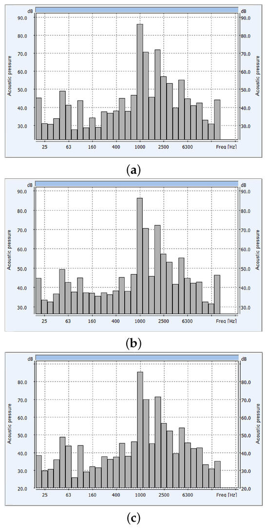 Equivalent Continuous Sound Levels recorded for key ‘c’ of organ pipe and for a pallet opening of (a) 25%, (b) 75%, (c) 100%.