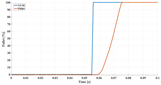 As can be seen, the full pallet opening time is 20 ms. Therefore, the relationship between the linearly varying VCM value and the pallet opening is displayed in Figure 7.