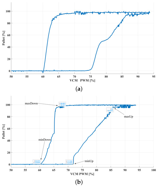 As shown in Figure 8a,b, clearly, the most important issue in controlling the key operation is the elimination of hysteresis phenomena. For this reason, a mathematical relationship can be established between the VCM and the opening/closing pallet by the characteristic curve. First, note that the PWM signal should be set above 70% of its maximum value to overcome the static resistance. Then, in the range between 70% and 86%, the relationship between the pallet opening and the PWM signal is fairly linear. Above a value of 86% of the PWM signal, the change in pallet opening is already insignificant. Similarly, when changing the PWM signal in the opposite direction (closing the pallet), the first reaction can be observed at a PWM signal less than 67% and when the PWM signal is equal to 60%, the pallet is fully closed. In addition, note that the PWM signal should be 0 when the key is not pressed for energy reasons. This avoids unnecessary heating of the motor.