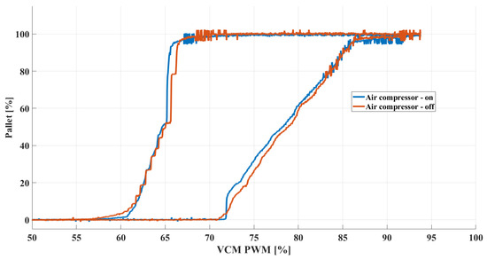 PWM signal and pallet opening (%) in case of air compressor on and off.