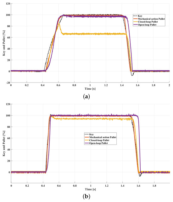 Figure 11a,b show the results for open-loop mode. When the key is pressed, the flap opening delay is about 15–18 ms. The results are similar for both fast and slow key presses. At the initial position for the fast action of key press and opening pallet, the delay is 75 ms and for the slow one is 55 ms. It is worth noting that in this case for two settings of tuning parameters = 1 and = 1.3, the flap opens at 100%. If the value of parameter is greater than 1, the performance of the system will not increase appreciably, and the overall system behavior may become more aggressive. Finally, the performance of the two proposed control systems with the mechanical action are compared and shown in Figure 12a,b.