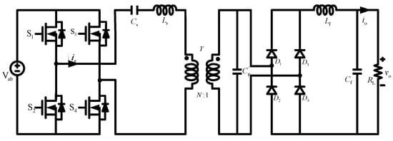 The topology of the LCC resonant converter is illustrated in Figure 2. From a topological perspective, the LCC resonant converter exhibits not only the characteristics of a series resonant converter for DC component isolation and transformer protection but also possesses wide-range input/output regulation capabilities akin to those of a parallel resonant converter. Consequently, it demonstrates excellent constant current source characteristics and robust output short-circuit resistance [19,20]. In order to optimize the volume of resonant converter, reduce the circuit current and circuit equivalent capacitance, increase the characteristic impedance of resonant network, and reduce the current stress borne by the converter, the parallel resonant capacitor () is designed on the secondary side of the transformer, so that the parallel resonant capacitor () and series resonant inductor () become parasitic parameters that cannot be ignored by the transformer under high frequency operation. It has a good internal short-circuit protection function.