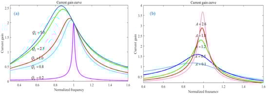 Parameter influence curve of current gain: (a) QL value current gain influence curve; (b) A value current gain influence curve.