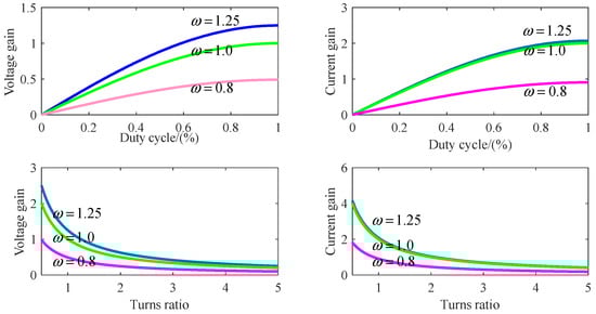 According to the influence curves of d and n values on current and voltage gain, it can be seen that the voltage/current gain is affected by the duty cycle d, the number of turns of the transformer n, and the frequency ratio ω. When the duty cycle and the number of turns of the transformer are determined, the output current and voltage gain can be adjusted by adjusting the frequency ratio ω. At the same time, under the same duty cycle and transformer turns, when ω > 1, the voltage gain/current gain change is small. When ω < 1, the voltage/current gain change difference is large.