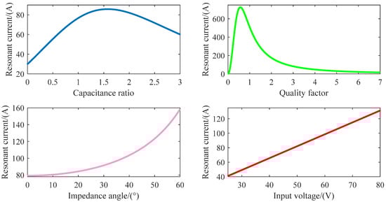 The characteristic curve of resonant current peak Ir affected by capacitance ratio A, quality factor QL, impedance Angle φ and input voltage Vi is shown in Figure 5. It can be seen from the characteristic curve that when the converter current gain, load and input voltage are constant, the smaller the φ is, the smaller the value of Ir is, and the smaller the current stress of the switching tube is. Only by ensuring φ > 0 can the ZVS conduction of the MOS tube be ensured, and a sufficient margin is often left in the actual selection, generally within the range of 15° < φ < 30°. At the same time, too small a quality factor and capacitance ratio will cause the resonant current peak to be too large, and the increase in input voltage will also cause the resonant current to increase.