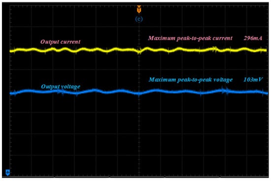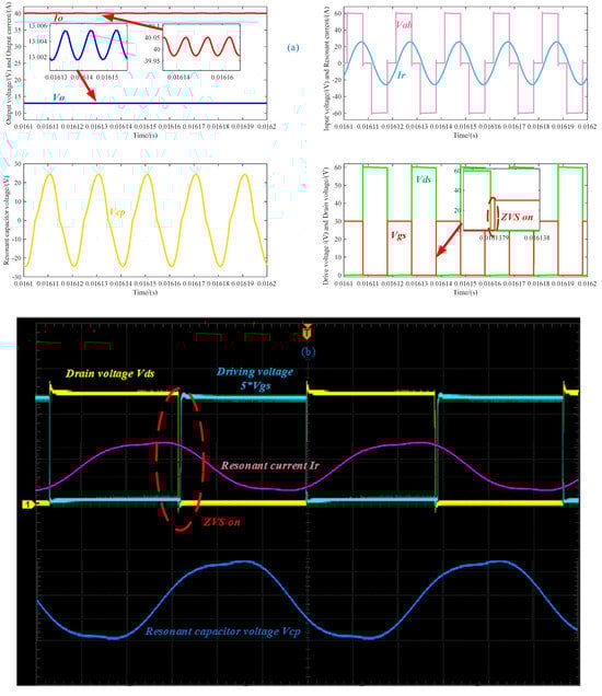 The simulation and test results of the constant current (40 A) characteristics of the semiconductor laser power supply are shown in Figure 9, where Vgs and Vds are, respectively, the drive voltage and the drain-source voltage of the MOS tube, Vab is the input voltage of the resonant network, Ir is the resonant current, and Vcp is the shunt capacitor voltage. It can be seen from the simulation and test results that the variable frequency phase-shift composite control method extends the input voltage/output power range of the LCC resonant converter by synchronously adjusting the switching frequency and duty ratio, narifies the switching frequency range, and effectively reduces the current and voltage stress of the switching tube. The output current ripple coefficient is <0.8%, and the output voltage ripple coefficient is <0.45%. It can realize ZVS conduction under any power input voltage, effectively reduce the loss of power tube, and improve the performance of LCC resonant converter.