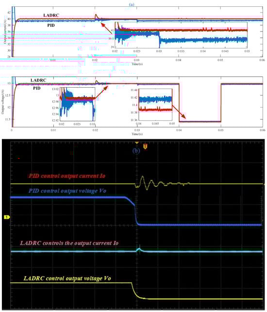 The simulation and test results of anti-interference characteristics of semiconductor laser power supply are shown in Figure 10. When t = 0.02~0.03 s, the input voltage Vin = 60 V changes to Vin = 80 V, and when t = 0.04~ 0.05 s, the load switches from full load to light load. According to the simulation and test results, the output current of the PID algorithm has a fast response speed, a large overjump, a large error and a large current ripple. When the input voltage or load is transformed, the ripple of the current and voltage increase, and the current and voltage remain at the set value. Therefore, the LADRC algorithm has a good performance in anti-interference.