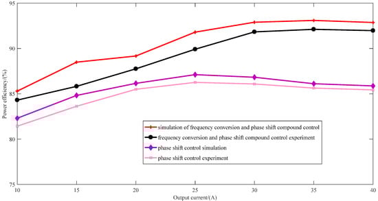 The simulation and test outcomes of the semiconductor laser power supply efficiency, as illustrated in Figure 11, reveal that the conventional frequency conversion control exhibits limited output adjustment capability and stability, leading to an overall low power supply efficiency. Consequently, only traditional phase shift control and composite control with frequency conversion phase shift are subjected to testing and analysis. Based on the simulation and test results, various control strategies yield differing power efficiencies; specifically, the phase-shifting control strategy induces hard switching states in the converter switch, thereby increasing switching losses and reactive power losses of the resonant converter. By implementing the inverter phase-shifting compound control under full load conditions, a maximum power supply efficiency of 92% can be achieved concurrently with superior constant current characteristics.