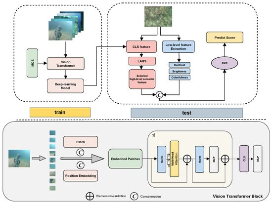 The proposed UIQM-LSH architecture includes a training module and a testing module. In the training module, the deep-learning model is obtained according to the image and the corresponding subjective quality score (MOS) through the vision transformer block. The structure of the vision transformer block is shown below the dashed line. In the test module, CLS features are extracted from the training model and high-level semantic features are selected from the LARS module. The predicted quality score is obtained by the SVM model.