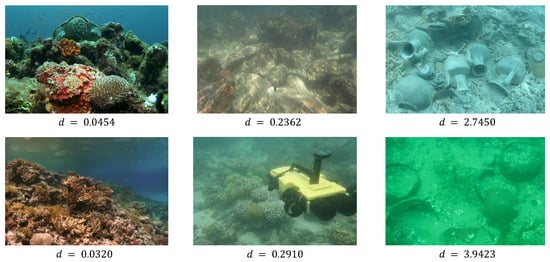 where is a small constant introduced to reduce instability, typically set to 0.0001 based on empirical values. The larger the ratio index d is, the greater the degree of color cast in the image is. Figure 2 shows some underwater images with color cast. Intuitively, as the degree of color cast in the underwater images increases, the value of the ratio index d correspondingly increases.