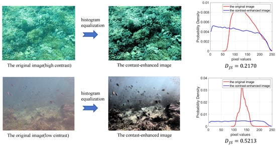 where . Finally, we use the J-S divergence to characterize the global contrast of the underwater images. In Figure 3, we plotted the results of enhancing the contrast of high-contrast and low-contrast images through histogram equalization. The results of the histogram distribution show that after histogram equalization, both the high-contrast original image and the low-contrast original image exhibit a more even histogram distribution, resulting in improved contrast. Additionally, we calculated the values for both original images. It is shown that the low-contrast image has a higher JS divergence compared to the high-contrast image.