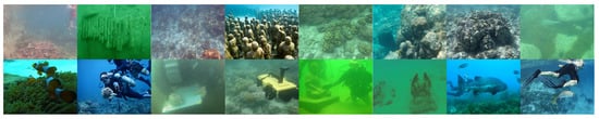 In order to verify the effectiveness of our proposed UIQM-LSH, we conducted extensive validation experiments on the authentic underwater dataset, namely the underwater image quality assessment database (UWIQA). UWIQA contains 890 underwater images of different qualities [] and is the largest public UIQA dataset at present. The labels, namely MOSs, are obtained by single-stimulus methodology, where each image is scored by a number of observers and the average value of these scores is considered the MOS. In Figure 4, we give example images of the UWIQA database. As can be seen, these images contain rich ocean features and a wide range of distortion types, thus ensuring a reliable evaluation of the proposed method.