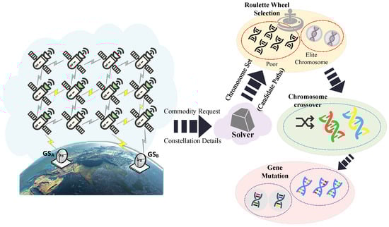 In this section, we will introduce our inter-satellite routing algorithm and the first and last hop selection methods for ground stations to access and exit the constellation. Our inter-satellite routing algorithm is a heuristic method based on GA, which can effectively solve the UMCF problem and assign a unique path for each commodity. Our first and last hop selection methods for ground stations are simple methods based on the greedy strategy, which can select the optimal satellite node as the first and last hop according to the source and destination of the commodity. We will describe these two methods in detail in Section 4.1 and Section 4.2, respectively. Before introducing the GA to our problem, we will introduce linear relaxation for MILP, the constraint in our problem. represents that each commodity can only select a single fixed path to send traffic. This is an NP-hard problem. By replacing this constraint with , we obtain the linear relaxation form of the problem. In the linear relaxation problem, each commodity is allowed to split its traffic among multiple paths. This linear relaxation problem can reduce the complexity in solving the original problem.