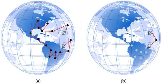 The next-generation Internet, based on terrestrial networks and mega-satellite networks, is rapidly growing as an up-and-coming future network with the development of commercial satellites such as Starlink, OneWeb, and Telesat []. LSNs offer key advantages over terrestrial network solutions, including global network access, low deployment costs, and 24/7 availability. Moreover, LSNs provide lower communication latency and higher data rates compared to GEO and MEO satellite communication systems []. The advantages of LSNs make them a crucial infrastructure in the development of the next generation of space–air–ground integrated networks. Given the LSN’s ability to support a range of applications, including telecommunication, remote sensing, location, and navigation, it is essential to enhance the performance of LSN facilities in response to their dynamic topology.