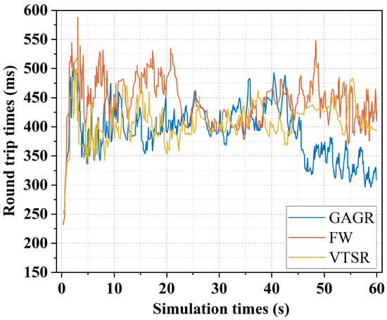 Firstly, we calculated the RTTs of all commodities under the TCP protocol under the three routing algorithms, as shown in Figure 3. The simulation time is within [0, 45] s; our proposed GAGR algorithm has an average RTT of 404.02 ms, while the FW algorithm has an average RTT of 469.57 ms, and the VTSR algorithm has an average RTT of 453.93 ms. The average RTT ratio of the GAGR algorithm to the FW algorithm is 0.86, and the average RTT ratio to VTSR is 0.89. The average RTT of our proposed routing algorithm is better after 45 s; our proposed GAGR algorithm has an average round-trip time of 334.93 ms, while the FW algorithm has an average round-trip time of 482.01 ms, and the VTSR algorithm has an average round-trip time of 438.84 s. Compared with the FW algorithm, the average RTT ratio of GAGR is 0.69, and, compared with the VTSR algorithm, it is 0.76.
