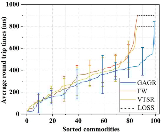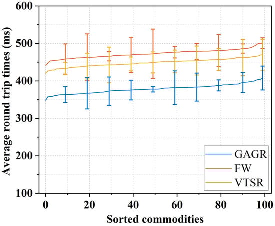 In Figure 4, we show the average round-trip times of 100 commodities within the simulation time based on the UDP protocol and sort them in ascending order. During the entire simulation time, the average RTT of the GAGR algorithm is 378.51 ms, the average RTT of the FW algorithm is 472.64 ms, and the average RTT of the VTSR algorithm is 448.42 ms.