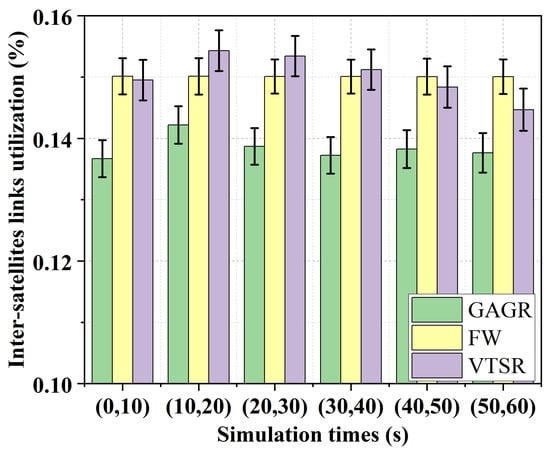 Secondly, we calculate the ISL utilization of all commodities under the TCP protocol under the three routing algorithms, as shown in Figure 6. We divide the simulation time into 10 s intervals, which can capture the dynamic changes in the network performance and the influence of our algorithm over time, showing the advantages of the GAGR algorithm in reducing the link utilization. Obviously, in all simulation intervals, the link utilization of the GAGR algorithm is lower than that of the FW algorithm and VTSR algorithm. The average link utilization of the FW algorithm is the highest, followed by that of the VTSR algorithm. Because the paths found by these two algorithms are not satisfactory, the number of forwarding hops is greater and more ISLs need to be passed. Similar to the situation under TCP, the monitoring link utilization under UDP is as shown in Figure 7. The link utilization of the GAGR algorithm is still the lowest among the three, because the approximate optimal solution is found in the optimization and iteration process of the candidate path, which reduces the number of forwarding hops.