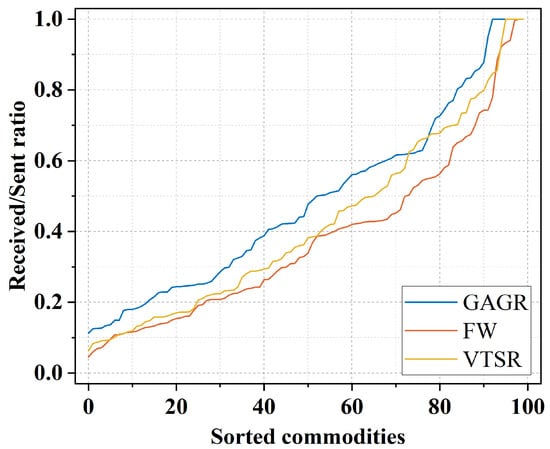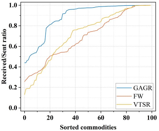Furthermore, we sort each commodity based on its receive–send comparison according to the TCP protocol, as shown in Figure 8. Among the receiving performance of 100 commodities, the average receive–send ratio of our proposed GAGR algorithm is 0.49, with that of the FW algorithm being 0.38 and the VTSR algorithm being 0.42. In the UDP protocol, as shown in Figure 9, the average receive–send ratio of our proposed GAGR algorithm is 0.89, with that of the FW algorithm being 0.69 and the VTSR algorithm being 0.72. It can be seen that the GAGR algorithm has better throughput and provides more reliable network services.