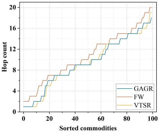 Finally, we compare the three routing strategies in terms of the number of hops for each commodity, as shown in Figure 10. FW requires the highest number of forwarding steps to complete a request, while GAGR has an average of 9.35 hops per commodity request and VTSR has an average of 9.44 hops per commodity request.