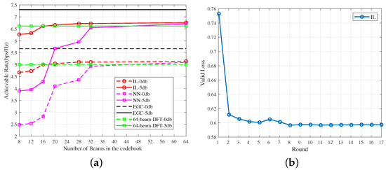 The figures of achievable rate comparison utilizing different methods and the model convergence of IL-based methods: (a) average achievable rate versus the number of beams of the codebook utilizing different methods; and (b) valid loss versus the IL round.