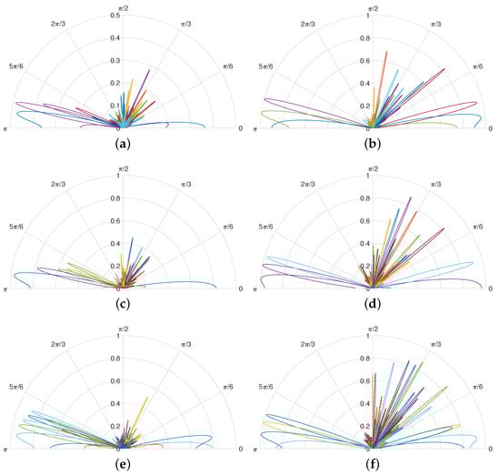 Beam patterns for the codebook with 20, 32, 64 beams learned by the self-supervised NN and the IL solution in multipath setting: (a) 20-beam NN codebook; (b) 20-beam IL codebook; (c) 32-beam NN codebook; (d) 32-beam IL codebook; (e) 64-beam NN codebook; and (f) 64-beam IL codebook.