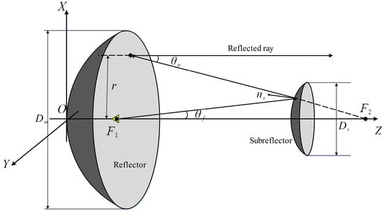 A geometric diagram of the dual-reflector antenna is shown in Figure 1. In this figure, is the angle between the Z-axis and the reflected electromagnetic wave from the feed, and is an angle between the main surface and the Z-axis after the reflection of the electromagnetic wave emitted by the sub-reflector.