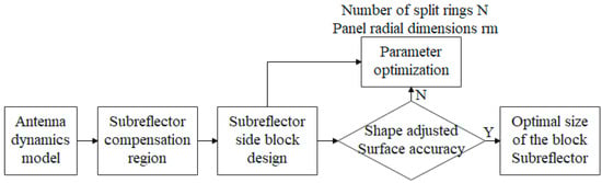 The analysis model of the impact of the adjustment point displacement on the position of the entire panel is established based on the thin-plate bending theory in this section, which is based on the relationship between the change in the shape of the sub-reflector and the phase of the aperture field. And then, sub-reflectors are designed in blocks, and their size and quantity are optimized. Finally, a set of optimal-size and -quantity parameters are obtained. The sub-reflector is bent by utilizing an actuator to adjust the panel corner’s displacement. An optimization design flow chart of the sub-reflector array size of blocks is shown in Figure 4. The panel’s radial dimension is denoted by rm. To create a sub-reflector, we arrange the trapezoidal panels in rings.