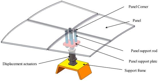 In this paper, a trapezoidal panel is used to obstruct the sub-reflector, and the panel’s four corners are used to alter the location. The sub-reflector is made up of several panels that can be modified together using one adjustment mode. A position adjustment diagram of the panel is shown in Figure 5. The shape of the sub-reflector can be changed by adjusting the position of each panel to compensate for the deformation of the main reflector.
