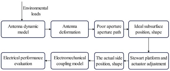 The antenna will be affected by the environmental load in the operational environment, resulting in reflector distortion and antenna aperture field distortion. The antenna gain can be reduced, and the beam direction can be deflected as a result of this issue. Firstly, an electromechanical coupling model is established to analyze the influence of reflector deformation on the antenna’s electrical performance, and then, the shape change and position change of the block side face used to compensate for the electrical performance are calculated. Finally, the shape of the sub-reflector and the change in position are introduced to examine the compensatory impact of the deformation antenna. A flow chart of the electrical performance compensation is given in Figure 7:
