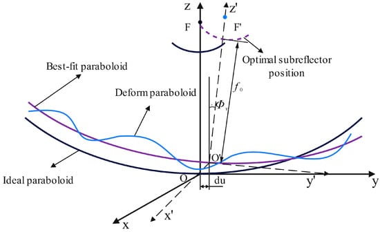 The form and posture of the antenna sub-reflector will cause beam deflection, so changing the sub-reflector position can compensate for the pointing error caused by antenna deformation. In this section, according to the best fitting paraboloid theory, six deformation parameters of the deformation paraboloid relative to the ideal paraboloid are calculated by fitting the best-fitting paraboloid, namely, , and . We can use the following formula to calculate the optimal vertex position of the sub-reflector: