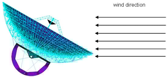 This part concludes the confirmation of the compensating effect, as well as the optimization design of the sub-reflector structure, taking the 65 m antenna as an example. The 65 m antenna structure is shown in Figure 11. The direction of the black arrow is the wind direction as shown in Figure 11. The 65 m antenna weighs 2640 t. A wind load with an average wind speed of 12 m/s is applied to the reflector. The equivalent wind force is applied to each node of the reflector on average, that is, the wind force is brought into the antenna dynamics model (4), and the deformation information of each node of the antenna reflector is obtained.