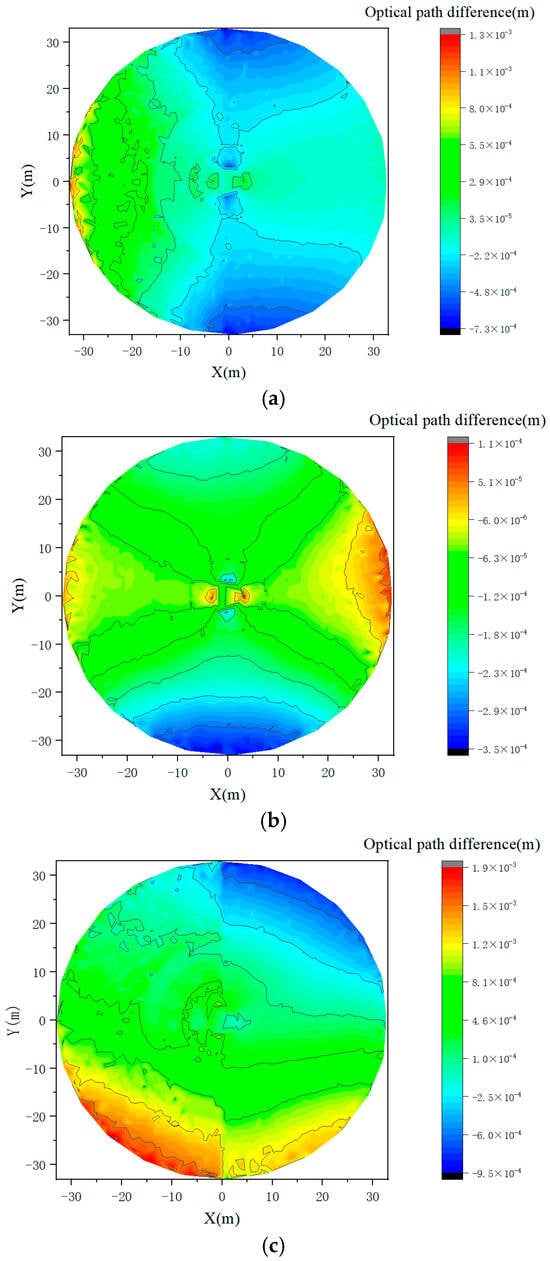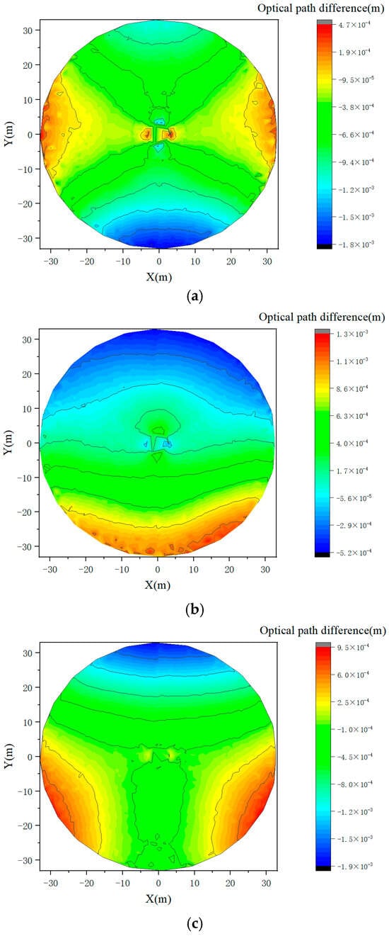 Optical path difference of aperture surface caused by gravity. (a) Optical path difference of aperture surface at 90°; (b) optical path difference of aperture surface at 45°; (c) optical path difference of aperture surface at 0°.
