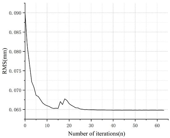 In the iterative process of calculating the dimensions of each panel of the sub-reflector, the optimization algorithm’s iterative curve is obtained, and is depicted in Figure 14. The vertical axis represents the form-face accuracy computed for the sub-reflector dimensions used during each iteration, while the horizontal axis represents the number of iterations. The form-face accuracy must drop to the accuracy requirement value, or 0.07 mm, in order for the iteration to end.