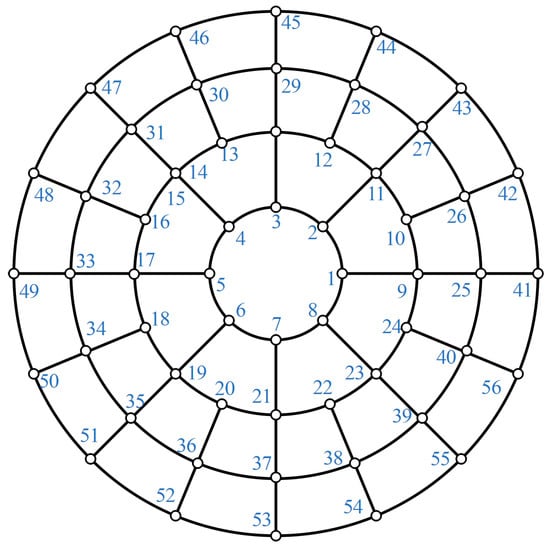 Following optimization, an overall structure diagram of the sub-reflector is shown in Figure 15, which consists of 40 trapezoidal panels and 1 circular panel. The blue number indicates the number of actuators used. One electric cylinder, out of a total of fifty-six, is utilized in the shared adjustment mode to control the position change of several panels.