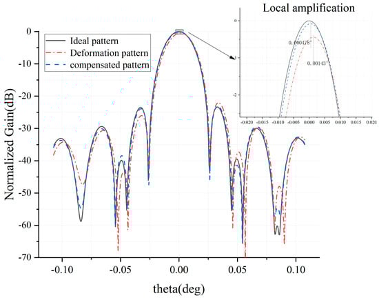 A compensated far-field pattern is obtained by introducing the distorted sub-reflector shape and the change in the sub-reflector’s form and posture into the electromechanical coupling model. The comparison of the far-field pattern of the antenna before and after using the shape adjustment of the sub-reflector and the attitude compensation of the sub-reflector is shown in Figure 18. According to the shape of the pattern in Figure 18, the gain of the 65 m antenna decreases by 0.44315 dB after adding wind load, resulting in a pointing error of 0.00143°. After sub-reflector compensation, the gain is increased by 0.36287 dB and the pointing error is reduced to 0.00047°.