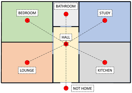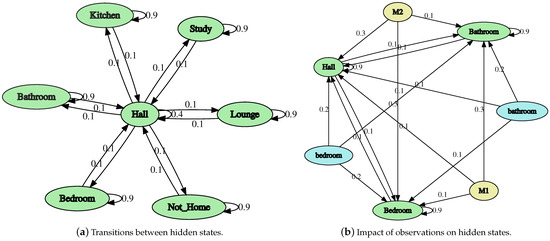 Figure 1 shows a schematic graphic of the SDHAR-HOME house morphology. As can be seen, it is not possible to make a transition between rooms without first passing through the hall. For this reason, in the A matrix of this Markov network, the probability of transition between rooms that are not interconnected is close to 0 (e.g., bedroom–lounge transition). With respect to the emission matrix B, the observations O taken into account are the motion sensors in the rooms and the data provided by the positioning beacons.