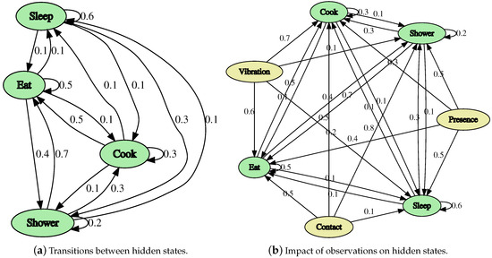 - Hidden states S: These correspond to the system variables that are unknown and that are desired to be recognised. In the case being addressed, they correspond to the activities carried out by the users within the household. These hidden states can be represented as follows:In (1), N corresponds to the total number of hidden states of the system and each refers, in this case, to each of the activities analysed.