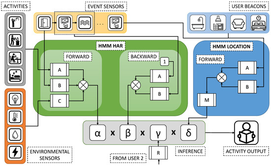 The overall HAR system architecture is summarised in Figure 4. This diagram shows the two HMMs implemented in the proposed method: on the left (HMM HAR) is the model that recognises the activity and on the right (HMM LOCATION) is the model that provides the room in which the user is located. It can be seen that HMM HAR has been implemented using a combination of forward and backward algorithms, while HMM LOCATION has only a forward stage. It can also be deduced that each algorithm is accompanied by its corresponding probability distribution matrices. The inputs of the HMM HAR forward stage are the activity distribution for the previous time , the action provided by an event sensor and the home conditions provided by the environmental sensors. In contrast, the backward stage relies only on the signals from the subsequent event sensors and . The inputs of the HMM LOCATION forward algorithm are the signals provided by the Bluetooth beacons and the events from the motion sensors (together with the probability distribution of the user’s position in the house at the previous time ). All outputs are multiplied in the inference block, together with the influence of the other user’s activity, to produce the most likely activity at time t.