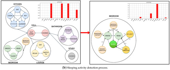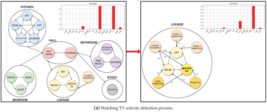 In Figure 5, two examples of the system’s operation can be observed. For instance, in Figure 5a, presence is detected within the living room. With this information, the probabilities of carrying out any possible action in the living room become equal. Shortly thereafter, presence on the sofa is detected and the television is turned on, leading the system to deduce that the user is currently watching TV. A similar scenario unfolds in the example in Figure 5b. The motion sensor detects presence in the bedroom, resulting in the equalization of probabilities for all possible bedroom activities. Upon detecting that the light is off and someone is lying in bed, the system infers that the user is sleeping.