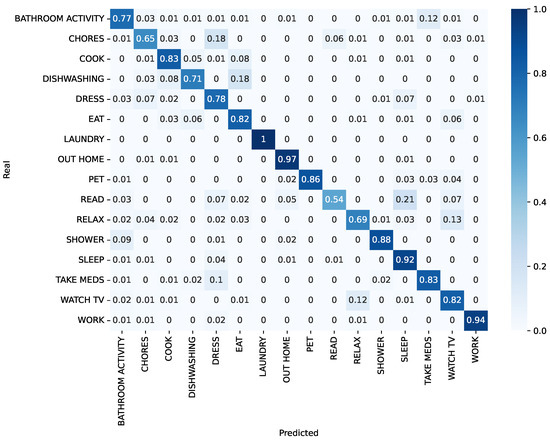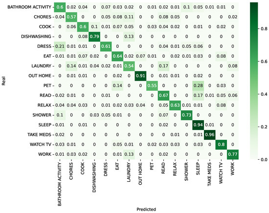 In order to evaluate the efficiency and accuracy of the unsupervised system presented in Section 3.2, data from the SDHAR-HOME database have been used, in conjunction with the system, in order to obtain the corresponding activities and compare them with the real activities from the database. Since the frequencies of the predicted and real activities are different (as the system provides predictions every time data arrive from the event sensors), an output sampling module has been used to compare them every second. Concerning error, it must be considered that a short time delay in recognising an activity is acceptable. There are activities with a certain temporal inertia, such as the “Shower” activity. When one of the users labels “Shower”, he/she takes some time to get into the shower and turn on the water, and it takes some time for the humidity in the room to increase. This time interval is not considered an error if the system has finally recognised the “Shower” activity with some delay. This happens with other activities, as the labelling of an activity does not coincide exactly with the start of the activity. For this reason, a module has been developed to analyse the time interval that the system takes to recognise the activity. If this time interval is less than 5 min, the prediction is considered correct. “Make Simple Food” and “Cook” have been grouped together as the sensors involved in the recognition are the same. The computational total time duration is 70 s to proccess the entire database. All activities labelled in the SDHAR-HOME database have been evaluated (16 activities in total). All the tests and experiments were conducted on an Intel(R) Core(TM) i7-10875H CPU @ 2.30 GHz/16 Gb with NVIDIA GeForce RTX 2060 GPU.