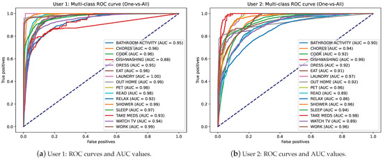 Figure 8 shows the different receiver operating characteristic (ROC) [106] curves obtained from the experimentation stage for both users. In both figures, the ROC curves for all possible activities can be observed. Furthermore, the value of the area under the curve (AUC) [107] for each of the activities can be checked. The ROC curves and the AUC value represent the sensitivity of the system to false detections, showing the degree of randomness of the predictions. From the AUC values, it can be concluded that the system is robust as the majority of activities are over 90%.
