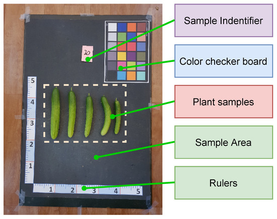 We constructed a data collection platform, as shown in Figure 1. The platform includes 2 rulers and a color checkerboard. The rulers were used to estimate the conversion ratio between a pixel and a length unit, and the color checkerboard was used for color calibration. The plant samples were put on the remaining region of the platform. The color of the platform was uniform and highly contrasted with the fruit color for ease of the image segmentation process. The dataset used in this study was acquired using a Samsung Galaxy Note 10 plus smartphone, which is equipped with a rear camera featuring a high resolution of 12 megapixels, an aperture of , with advanced autofocus capabilities.