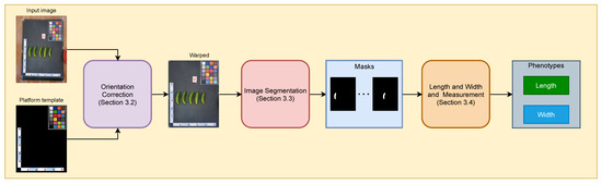 Figure 2 illustrates an overview of our method. The whole pipeline includes four modules: orientation correction, image segmentation, color correction, and measurements. At the beginning, an input image of cucumbers is warped and cropped using a platform template as a reference. The cropped image is then fed to the image segmentation module to extract cucumber masks, while the color correction module calibrates the color of the cropped image using the color checker on the board. We reuse the color correction module from previous work [6], which first extracts colors from the color checker board of the input image, then performs color correction on the input image to match the color space of the reference template. Finally, the masks and color-calibrated images are fed to the measurement module to extract important phenotypes, including the width, length, and color of the cucumber.