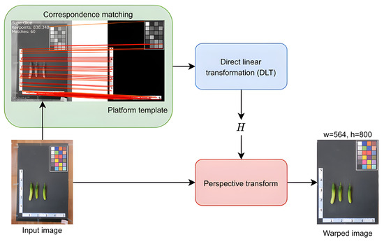 We select SuperGlue [14] for homography estimation because its pretrained model is available and performs well for both indoor and outdoor scenes. Figure 3 illustrates the flow of the orientation correction module. Initially, an image of cucumber samples and a platform template serve as an image pair. Subsequently, corresponding point pairs between the two input images are generated using the SuperGlue algorithm. These correspondences are then utilized to estimate the homography matrix H between the two views. Finally, the image of cucumbers is warped using the perspective transformation with the homography matrix H.