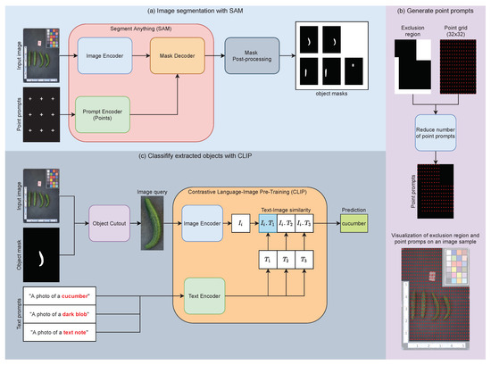 We create an effective zero-shot framework for segmenting cucumbers from an image by combining two widely used zero-shot models: segment anything (SAM) [15] and contrastive language–image pretraining (CLIP) [16]. Figure 4 illustrates an overview of the proposed image segmentation pipeline, which consists of two steps: (i) obtaining object masks via SAM (Figure 4a) and (ii) classifying segmented objects with CLIP (Figure 4c) and only keeping objects that are classified as a cucumber.