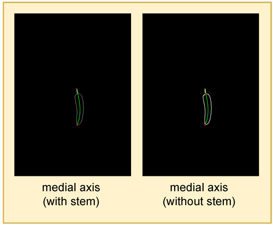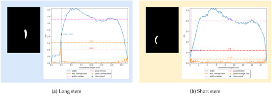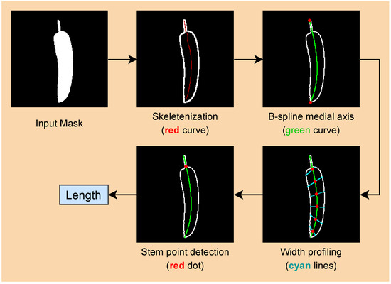 An overview of the measuring pipeline is illustrated in Figure 7. Starting with an input mask obtained from the image segmentation step, a morphological skeletonization [27] is applied to the input masks to reduce the binary masks to a 1-pixel-wide skeleton, also known as the medial axis. Next, we parameterize the skeleton as a B-spline curve [28] and then proceed to profile the input mask along the B-spline medial axis. The width of a cucumber sample is calculated from its mask’s width profile, as mentioned above. From the width profile, we can detect the transition point between the stem part and the body part, which is referred to as the stem point. Finally, the length of a cucumber is determined as the length of the medial axis curve segment between the stem point and one end of the medial axis.